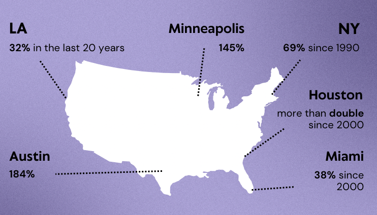 In major cities in the U.S, the number of immigrant artists have grown by 69% in New York (and not just because of the general increase in the population, as this was compared to a 30% increase in US-born artists); 32% in the last two decades in Los Angeles; a whopping 145% and 184% in Houston and Austin respectively; by more than double in Houston; and 38% in Miami since 2000 (Center for an Urban Future, 2020: 6).